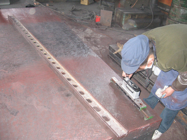 5.每次單面鏟刮完畢后,應用專用細號油石對臺面進行微力打磨,保證應鏟刮時因其的毛刺刺傷鏟刮人員和下次使用間距對鑄鐵平臺臺面拖研是帶來的劃傷。